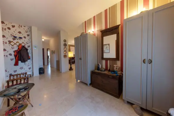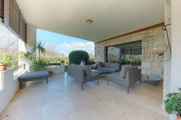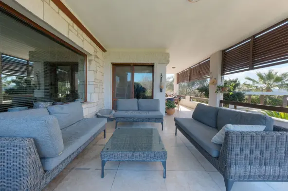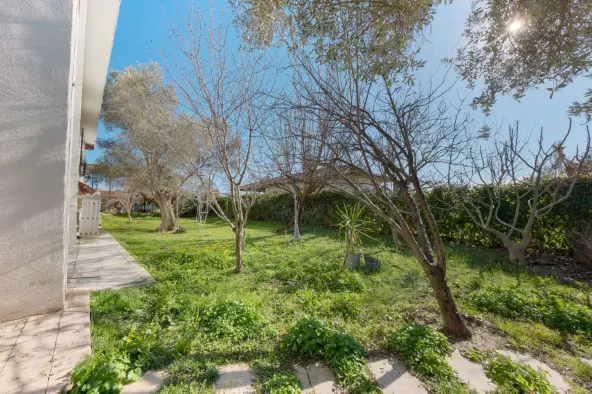 Natural stone and travertine details, teak wood joinery, and insulation applications highlight the overall build quality. With underfloor heating, large terraces and balconies, a private pool, and landscaped garden, it is suitable for both summer use and year-round living.